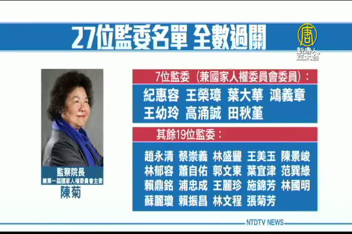 【新唐人亞太台 2020 年 07 月 17 日訊】立法院今天(17日)進行監察院人事同意權投票,朝野爆發激烈衝突。不過,總統府前秘書長陳菊,仍以65票同意票、3票不同意票通過,確定出任監察院長兼第一屆國家人權委員會主任委員。其餘 26位監委被提名人,也全數通過,將在 8月1日上任。其中,陳菊與7位監委,兼任國家人權委員會委員。總統府表示,蔡總統期待監委善盡憲法賦予職責,新設置的國家人權委員會更是任重道遠。