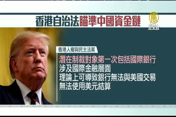 15 日,美國總統川普(Donald Trump)正式簽署香港自治法,香港自治法規定,如果跟遭制裁的官員有生意往來,銀行將面臨多項罰則,當中包括無法向美國的銀行貸款、參與外幣及銀行交易業務等。相較於香港人權與民主法案,潛在制裁對象第一次包括國際銀行,涉及國際金融層面,理論上可導致銀行無法與美國交易、無法使用美元結算,打擊中國資金鏈。