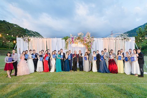 一首首愛與祝福的樂曲,伴隨著新人們進場,15對新人在阿管處處長馬惠達與番路鄉長林淸根以及親人的見證下,簽署愛情證書、交換愛的信物,完成浪漫的證婚儀式。今年的主題,以幸福地與對方相遇、華麗地與單身說再見,為新人們精心設計一場別具浪漫又獨特的星光晚宴。