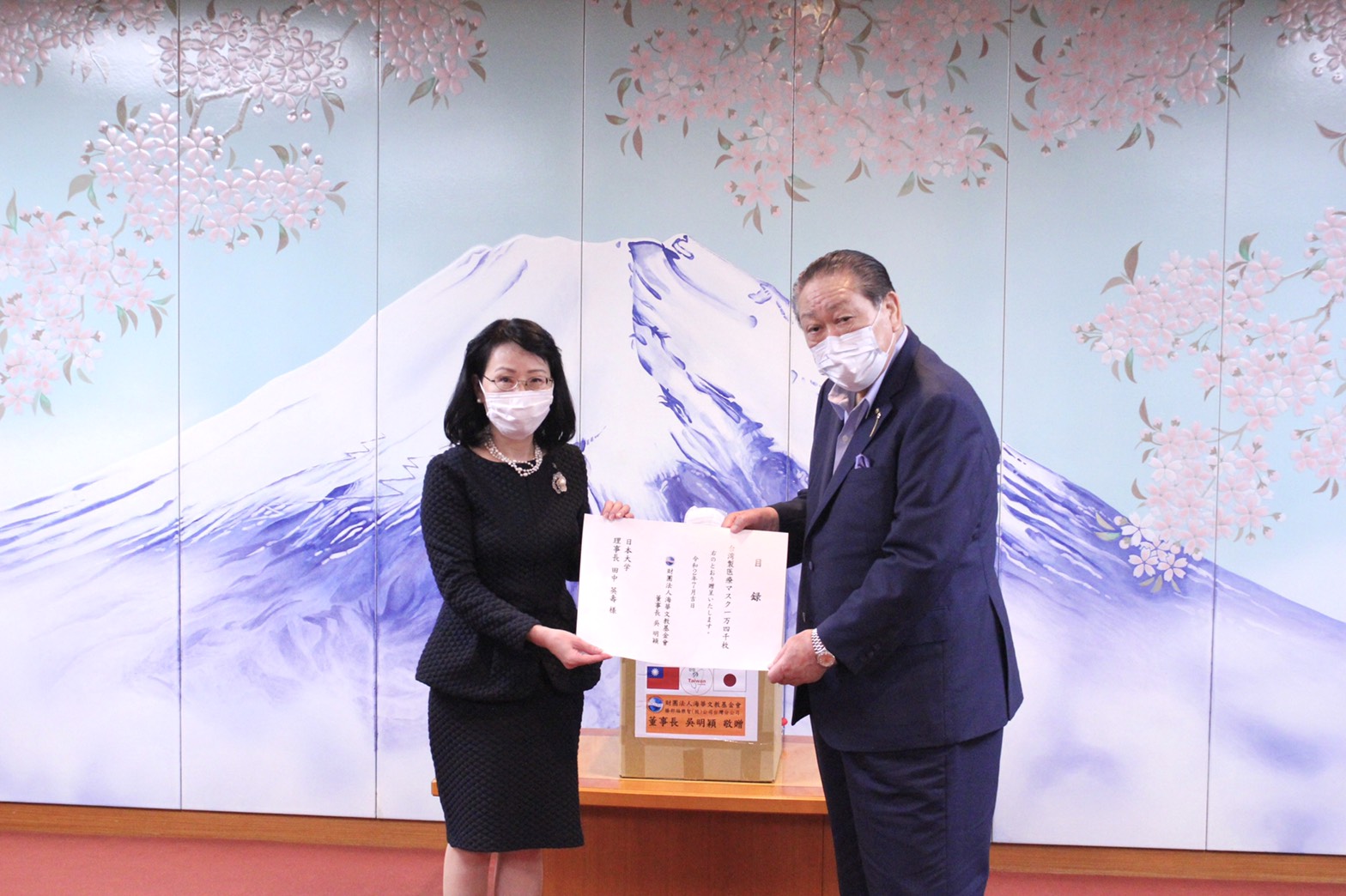 海華文教基金會透過僑委會訂購台灣醫療口罩10萬枚捐贈給日本10家大學醫療機構。圖左為代表台方出席捐贈儀式的東京台灣商工會副會長大川佳那,圖右為日本大學理事長田中英壽。(圖/海華文教基金會提供)