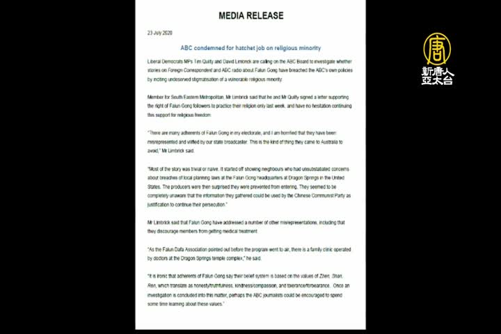 23號,澳洲自由民主黨議員奎爾蒂(Tim Quilty)和林布里克(David Limbrick)發出聯合聲明,認為澳大利亞廣播公司對法輪功的報導,是在煽動人們詆毀弱勢宗教少數團體,違反了ABC報導政策,呼籲ABC董事會進行調查。