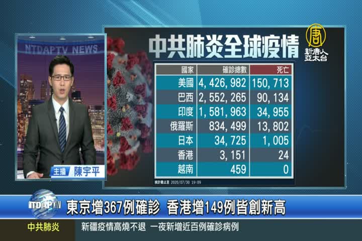 【新唐人亞太台 2020 年 07 月 30 日訊】來關心中共肺炎動態,目前全球公開數據,累計確診超過1千7百萬人, 66萬6千多人死亡。但中共、伊朗等國家,被認為嚴重低報數據。美國確診超過442萬6千人,15萬人死亡。巴西新增確診6萬9千多例、死亡增加將近1千6百人,單日新增確診及病亡數都創下新高。日本東京新增確診367人,再創單日新高。香港也再創單日新高紀錄,新增149例確診,並且是連續第9天超過百例。明天起放寬禁餐廳內用限制。