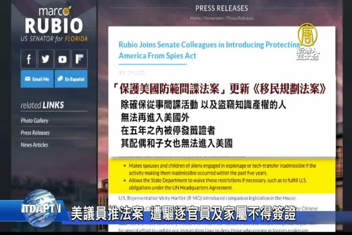 【新唐人亞太台 2020 年 07 月 31 日訊】週二,美國多位共和黨參議員,提出法案,拒絕向在美國從事間諜活動,或盜竊知識產權而被驅逐的個人,及其配偶和子女發放簽證。眾議院也將提出相關法案。