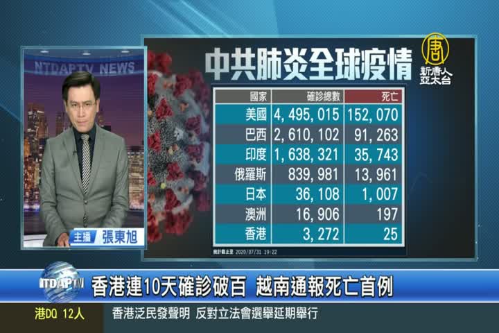 【新唐人亞太台 2020 年 07 月 31 日訊】再來帶您關心中共肺炎動態,目前全球公開數據,累計確診超過1千7百30萬人,將近67萬2千人死亡。但中共、伊朗等國家,被認為嚴重低報數據。美國確診超過4百49萬5千人,15萬2千多人死亡。巴西第一夫人蜜雪兒與科技部長龐特斯都確診,總統波索納洛內閣已有5名成員染疫。日本30日新增1千3百例確診,再創單日確診最高紀錄。東京今天新增463例確診,再創新高。越南新增45人染疫,也創單日最多紀錄,並出現疫情以來第一起死亡病例。香港再新增121起確診,其中118例都是本土病例,連續第10天破百。