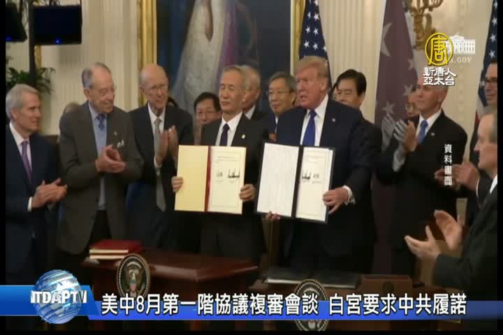 綜合外媒報導,有消息人士透露,美國同意與中共在8月15日,針對第一階段貿易協議舉行視訊會面,做為簽署六個月後的評估會議,包括中共未能實現,在兩年內採購價值2000億美元商品的承諾,白宮發言人週二呼籲中共,應履行承諾。