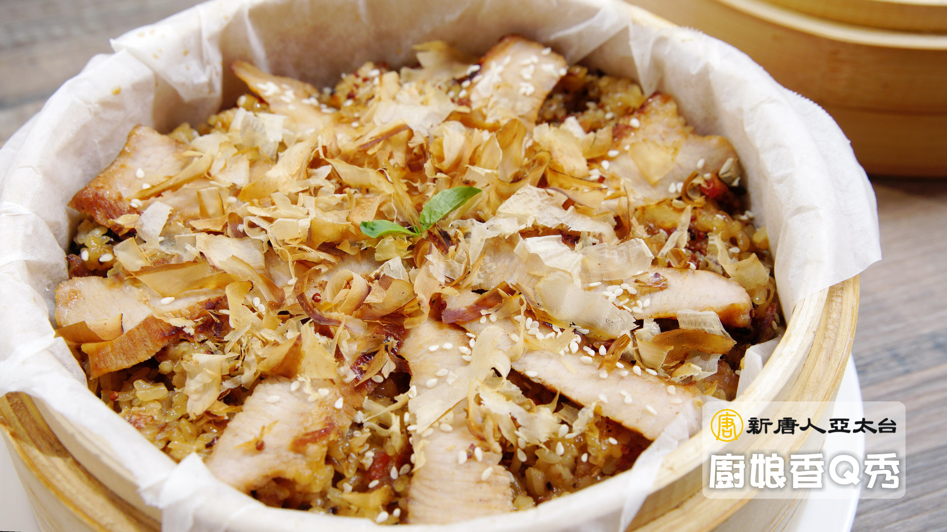 食材:松陂肉1片、細柴魚花適量、圓糯米490g、紅藜麥100g、乾香菇35g、麻油40g、蒜末20g、紅蔥末20g、醬油30g、糖20g、白芝麻10g、月桂葉1片