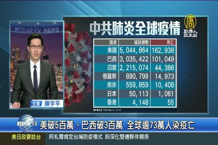 【新唐人亞太台 2020 年 08 月 10 日訊】歡迎回來,帶您來關心中共肺炎動態,目前全球公開數據,累計確診超過1千9百88萬人,死亡73萬人。美國累計確診超過 504萬例,死亡 16萬2千多人。巴西累計確診突破 303萬例,死亡 10萬1千多人。另外,印度前總統穆克吉也宣布確診,印度累計221萬例,死亡 4萬4千多人。日本方面,今天新增 491例確診,其中光東京就新增197例,日本累計確診突破5萬例。香港今天新增 69例,其中 67例是本土感染。另外,中共、伊朗等國家,被認為嚴重低報數據。