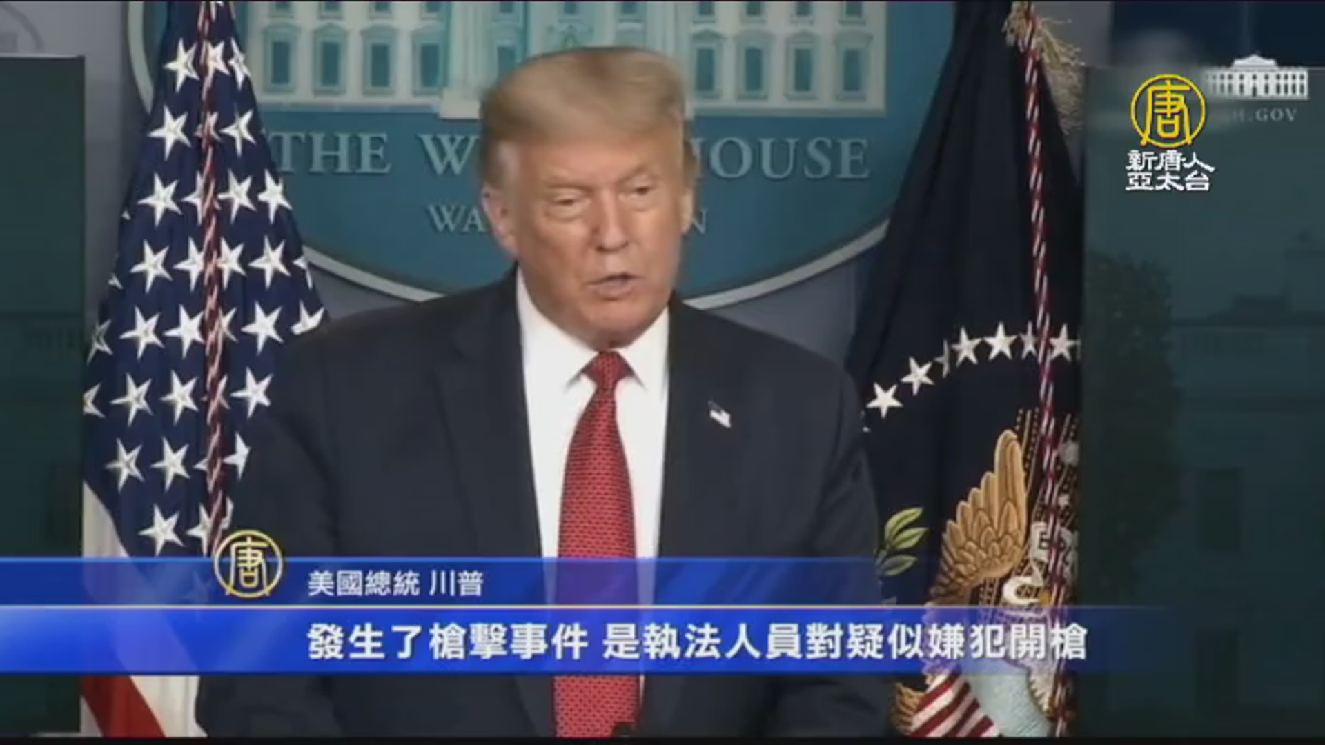 【新唐人亞太台 2020 年 08 月 11 日訊】最新消息,美國總統川普召開新聞發佈會時,白宮外發生槍擊事件,川普記者會也因此一度中斷,被帶往橢圓辦公室,但幾分鐘後,川普再次返回白宮新聞簡報室,親自通報槍擊事件。
