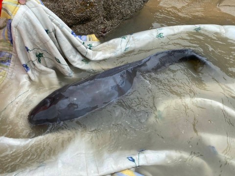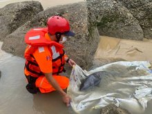 金門縣水產試驗所及金門縣野生動物救援暨保育協會人員,也在11時15分抵達現場,經比對該鯨豚品種為「露脊鼠海豚」,是一級保育類動物,研判為海豚幼體,因颱風期間風浪轉強,該幼體海豚體力耗盡而遭沖刷上岸。岸巡說,幸好只是皮肉擦傷,目前已由縣水產試驗所帶回照顧。