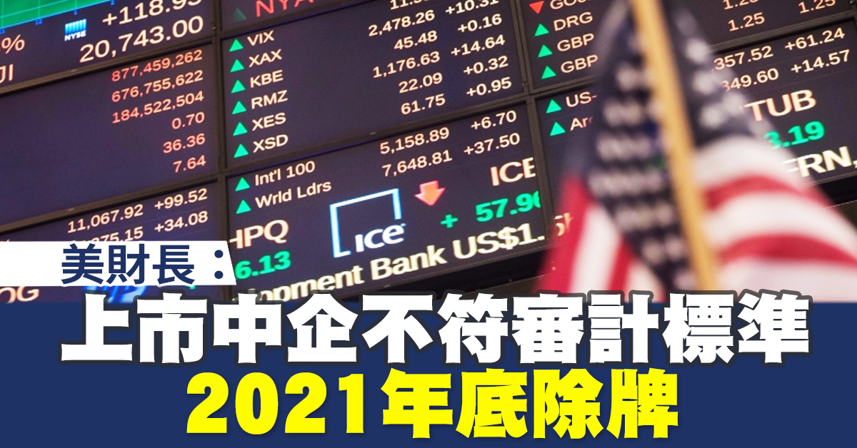 《路透社》11日報導,美國證券交易委員會(SEC)將採取行動,確保在美上市的中企,與美企遵從相同規則。財政部長梅努欽(Steven Mnuchin)週一(10日)表示,2021年底前,所有不遵守美國審計標準的上市中企,將從美國交易所除牌。