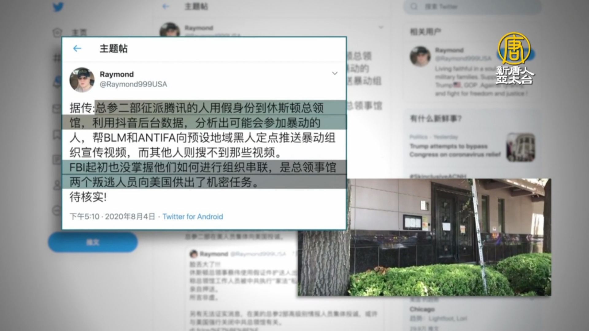 【新唐人亞太台 2020 年 08 月 11 日訊】近日,有消息指,美國聯邦調查局獲得情報,休士頓中領館利用抖音,支持「黑人的命也是命」的抗議和「安提法」(Antifa)暴亂,企圖以此阻撓川普連任。