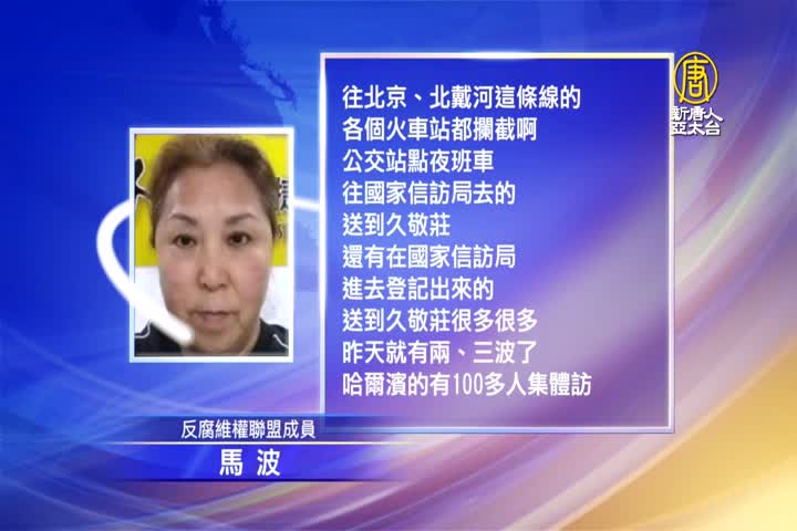 反腐維權聯盟成員 馬波:「往北京、北戴河這條線的各個火車站都攔截啊,公交站點夜班車往國家信訪局去的,送到久敬莊,還有在國家信訪局進去登記出來的,送到久敬莊很多很多,昨天就有兩、三波了,哈爾濱的有100多人集體訪,都送到久敬莊。」