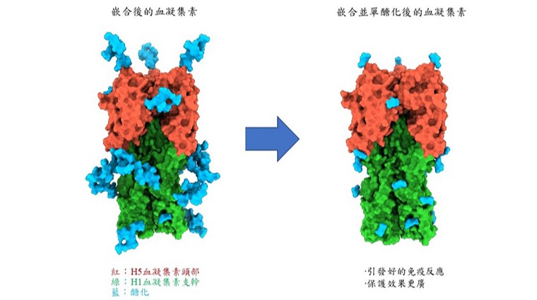 為了進一步優化疫苗效力,研究團隊還利用單醣化技術,修飾血凝集素上特定部位多餘的醣,簡化後的嵌合蛋白可以露出不易突變的區域,使得人體免疫系統更容易辨識、消滅已被感染的細胞。