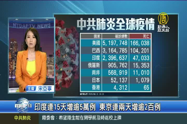 【新唐人亞太台 2020 年 08 月 13 日訊】歡迎回來,來關心中共肺炎動態,目前全球公開數據,累計確診超過 2千零65萬人,死亡74.3萬人。美國累計確診近 520萬例,死亡 16萬6千多人。印度單日新增 6萬7千例,連續15天新增超過 5萬例,累計確診近 240萬例,並且有第4名部長確診。另外,單日死亡 942例,累計死亡4萬7千人。日本東京都新增 206例確診,連續兩天超過2百例,日本累計確診5萬2千多例。香港新增 69例,其中65例為本土病例,死亡增加 2人。另外,中共、伊朗等國家,被認為嚴重低報數據。