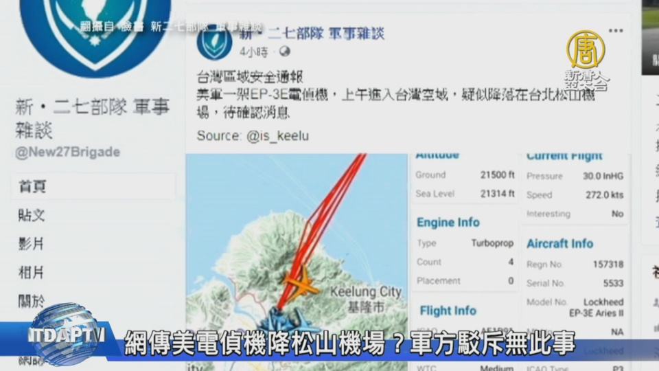 【新唐人亞太台 2020 年 08 月 18 日訊】好,美軍近日在西太平洋、南海活動頻繁,為的就要嚇阻共軍擴張,不過也要留意所謂「灰色衝突」的「假訊息」攻擊,今天,臉書社團上就有網友貼出一張航跡圖,聲稱美軍一架EP-3E電偵機在早上進入台灣領空,還疑似降落在松山機場,但據了解,台灣軍方駁斥說,「這是假訊息,並無此事」。