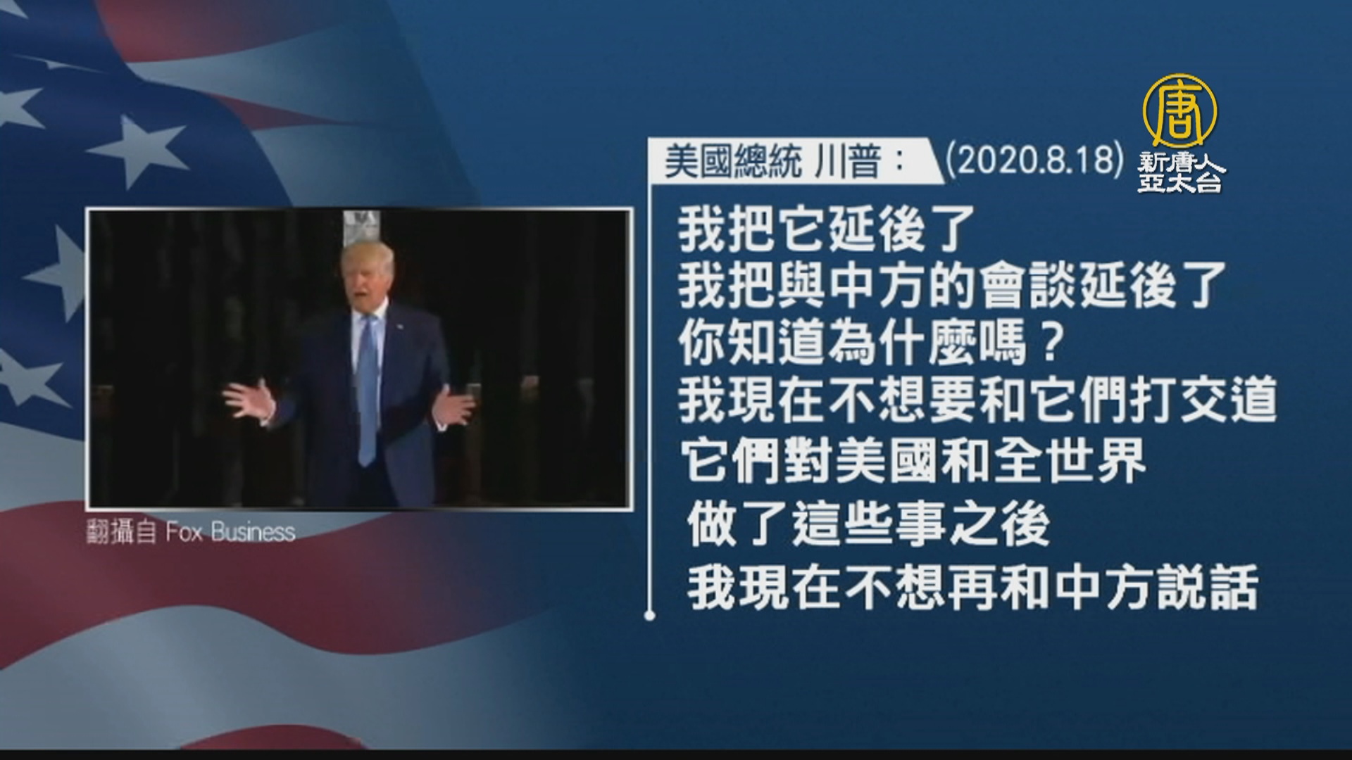 美國總統 川普(2020.8.18):「我把它延後了,我把與中方的會談延後了。你知道為什麼嗎?我現在不想要和它們打交道。它們對美國和全世界做了這些事之後,我現在不想再和中方說話。」