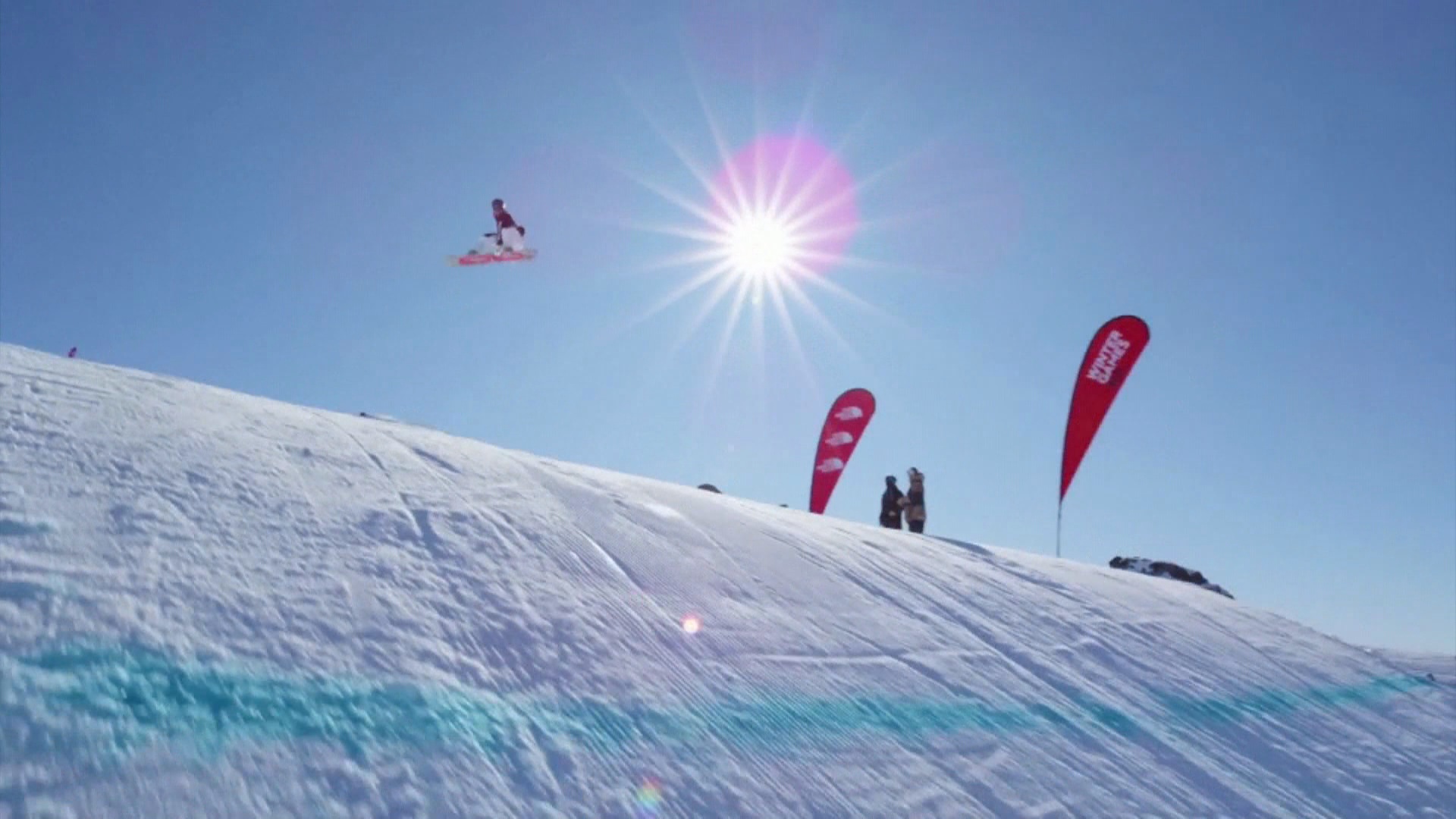男子單板滑雪冠軍,卡洛斯·加西亞·奈特,起跳跨過兩個雪峰,畫出完美長弧線,表現相當完美。