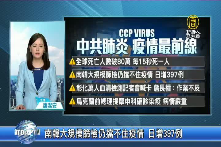 【新唐人亞太台 2020 年 08 月 24 日訊】接著來追蹤中共肺炎動態,全球超過2,300萬人確診,逼近台灣總人口數;全球死亡人數破80萬人,相當於每15秒就有一人病逝。南韓大規模篩檢仍擋不住疫情,日增397例。彰化萬人血清檢測記者會喊卡,台大教授詹長權表示:作業不及。烏克蘭前總理提摩申科確診染疫,病情相當嚴重。
