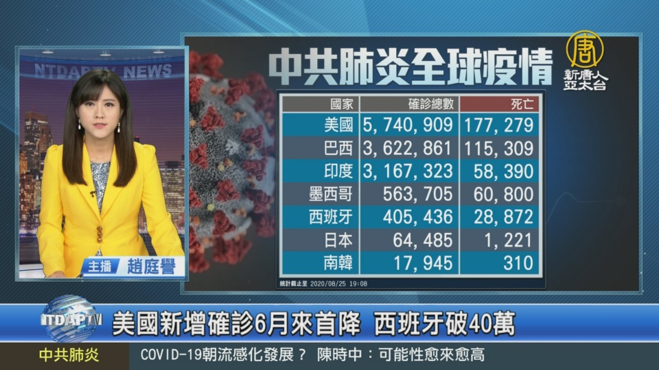 【新唐人亞太台 2020 年 08 月 25 日訊】來關心肺炎疫情最新情況,累計確診超過2千3百65萬人,81萬3千多人死亡。但中共、伊朗等國家,被認為嚴重低報數據。過去一週,美國新增確診29萬7千起,比7月中旬高峰的單週46萬8千起病例降低,目前美國單日新增少於5萬起,這是6月初以來首見。墨西哥死亡病例超過6萬例,排名全球第3,僅次於美國和巴西。西班牙新增2千多例確診,累計突破40萬例。南韓新增280例確診,單日新增連續12天達到三位數,首爾市教會的群聚性感染持續發酵。日本東京新增182名確診,連續第二天少於2百例。香港新增19宗確診,比前一天翻倍,16宗本地感染個案中,半數源頭不明。