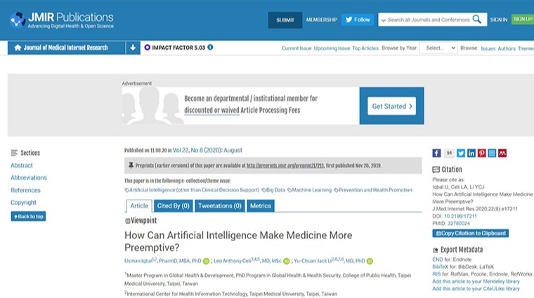 〈人工智慧如何讓醫療更加領先?〉(How Can Artificial Intelligence Make Medicine More Preemptive?)這篇研究論文,在2020年8月刊登在國際知名的醫學網路研究期刊(Journal of Medical Internet Research,JMIR),獲得不少迴響。通訊作者及第1作者分別是台北醫學大學醫學科技學院教授李友專和公共衛生學院助理教授烏斯瑪(Usman Iqbal),共同作者則為麻省理工學院運算生理實驗室臨床研究主任暨首席研究科學家Leo Antony Celi。
