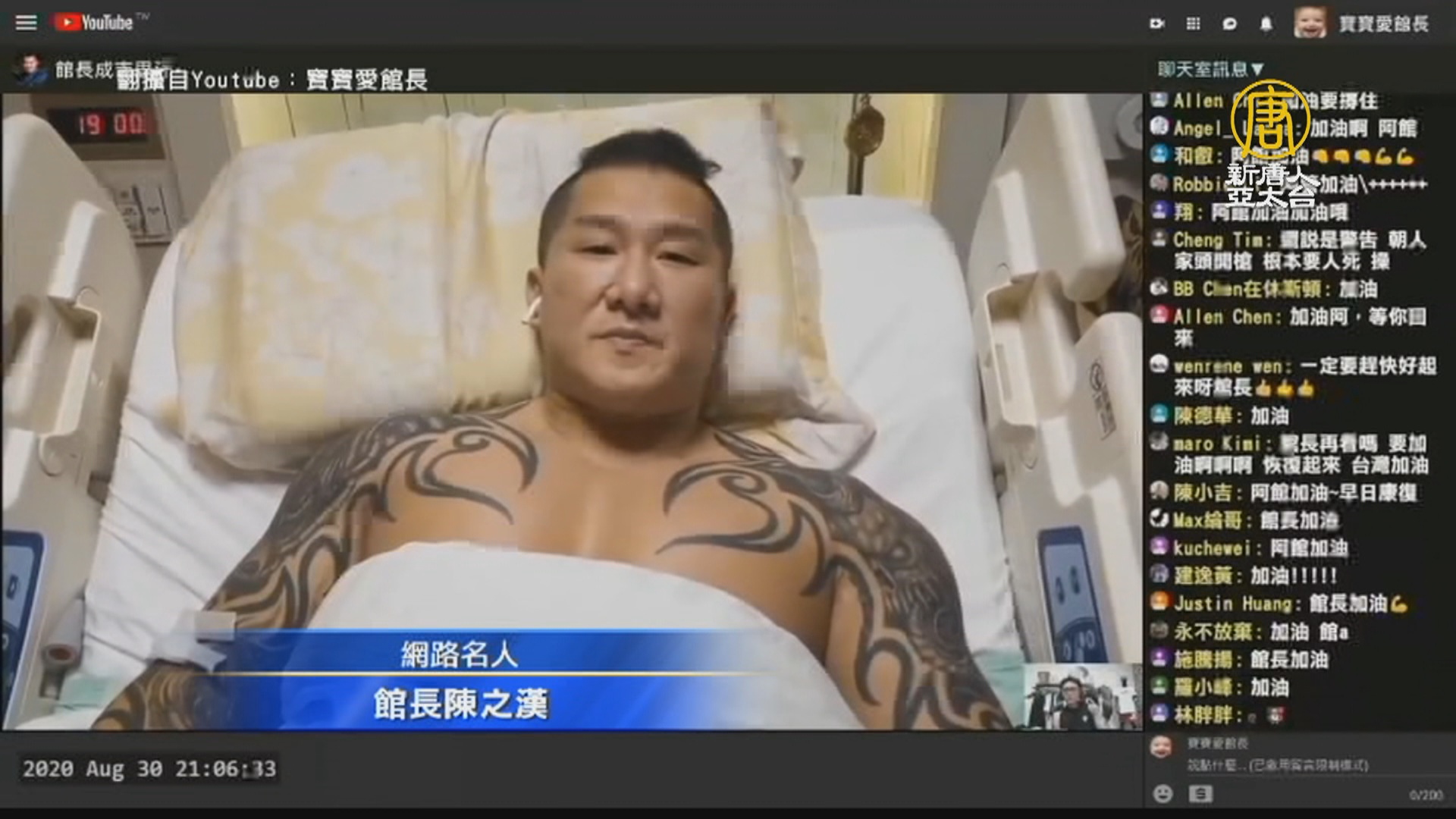 【新唐人亞太台 2020 年 08 月 31 日訊】網路名人館長陳之漢遭槍擊,昨晚人在醫院的他,首次親上火線直播,還原現場,表示兇徒第一槍,對準他的頭部,館長直指,這是買兇殺人。