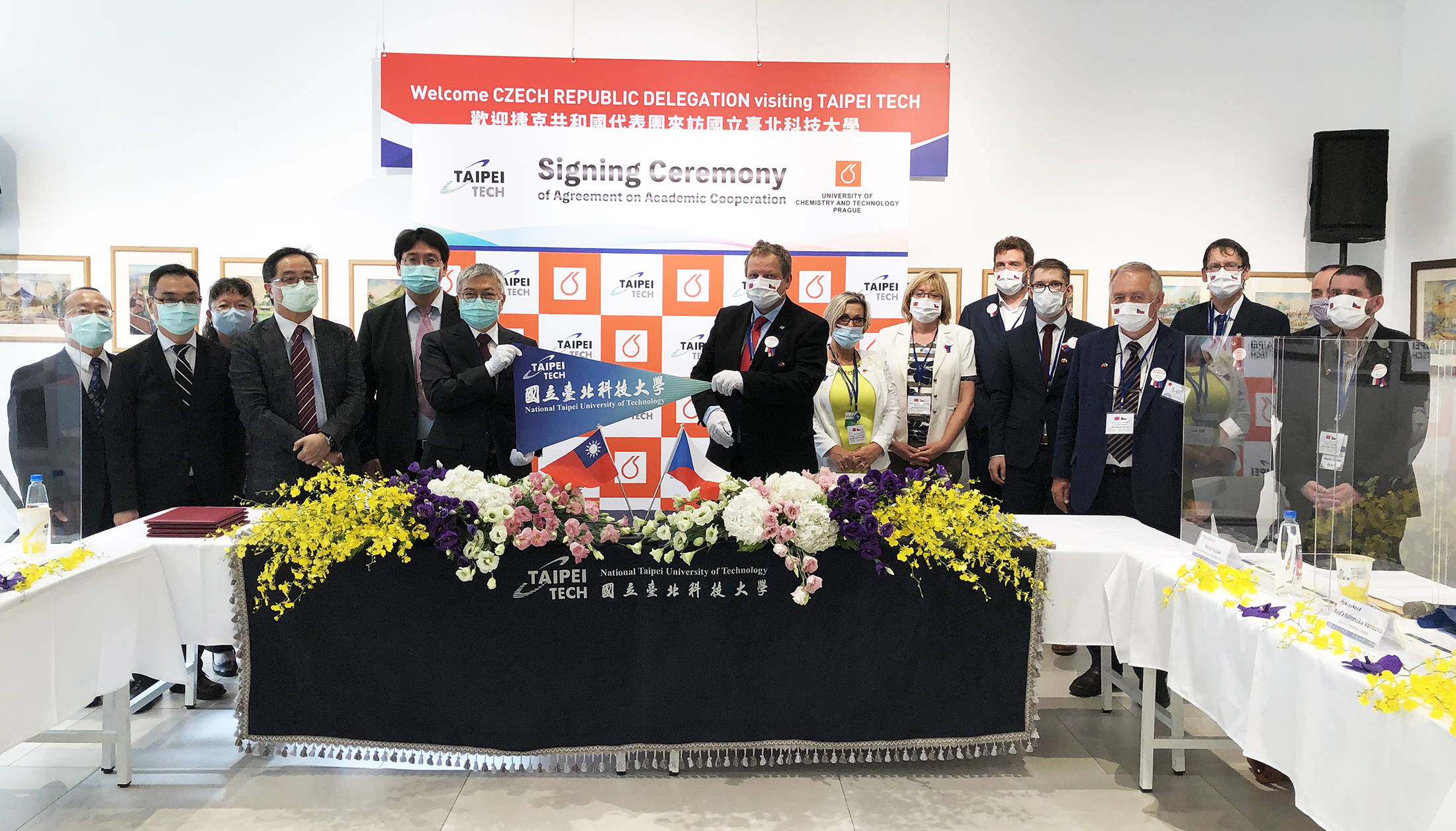 為配合防疫,與會人員採實名制管理,接待期間全程配戴口罩並保持安全社交距離,北科大與外交部事前密切合作檢視分流動線,北科大藝文中心會場座位均設防疫透明隔板,更備有捷克訪賓專用洗手間,訪賓離場後已加強消毒並靜置1天,並且與會人員均自主健康管理14天。