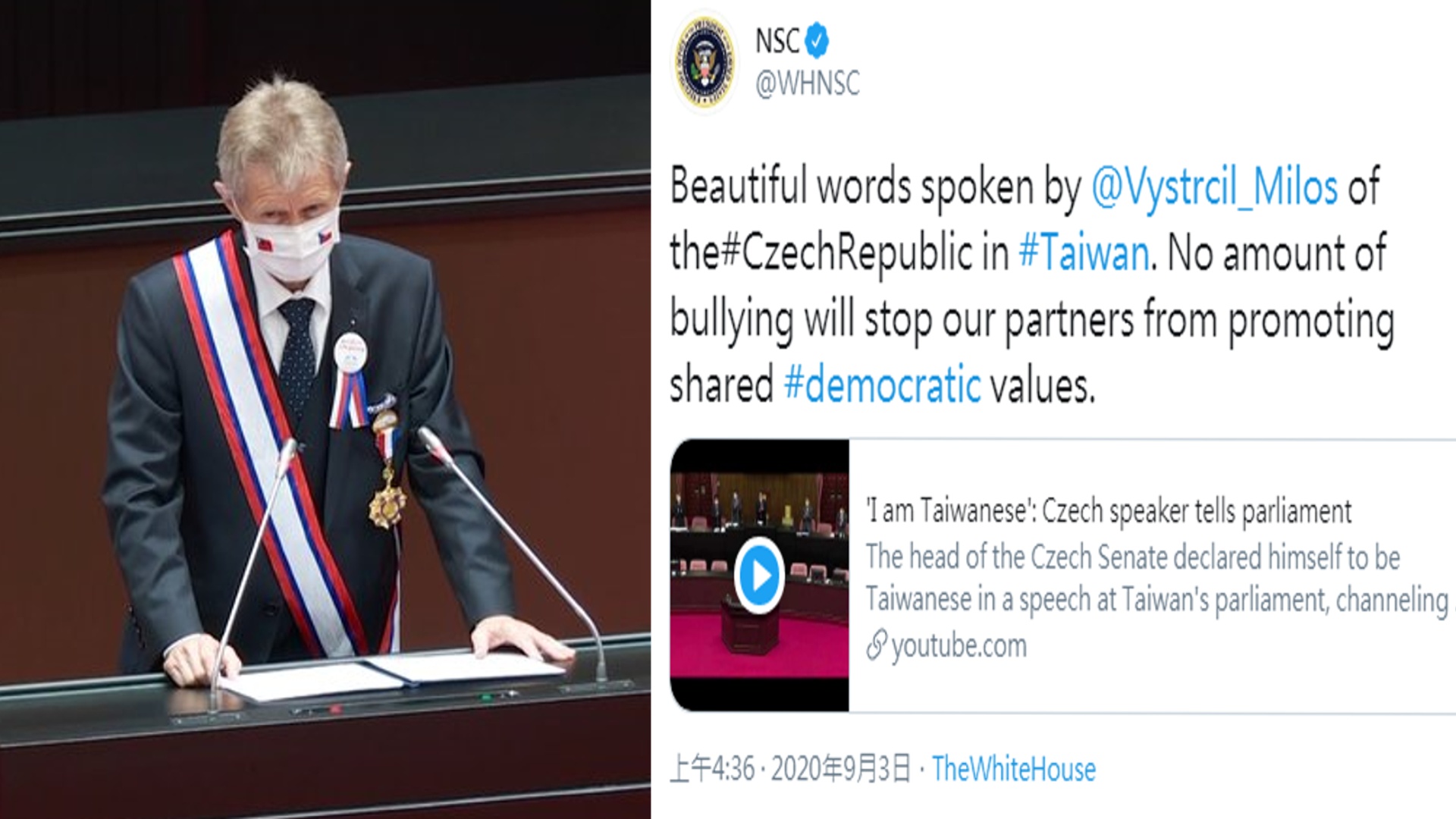 【新唐人亞太台 2020 年 09 月 03 日訊】美國白宮國安會在台北時間週四,在官方推特轉貼捷克參院議長維特齊日前在立法院以中文表示「我是台灣人」的外媒報導。國安會以「美哉斯言」形容維特齊在台灣立法院的演說,並說「再多的霸凌都無法阻止我們的夥伴促進共同的民主價值」。
