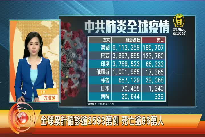 【新唐人亞太台 2020 年 09 月 03 日訊】午報頭條,先關心中共肺炎動態,目前全球公開數據,累計確診超過2千5百93萬人,死亡86萬人。美國累計確診超過 611萬例,死亡 18萬5千多人。巴西累計確診近400萬例,死亡 12萬3千多人。印度累計確診近 377萬例,死亡 6萬6千多人。另外,中共、伊朗等國家,被認為嚴重低報數據。