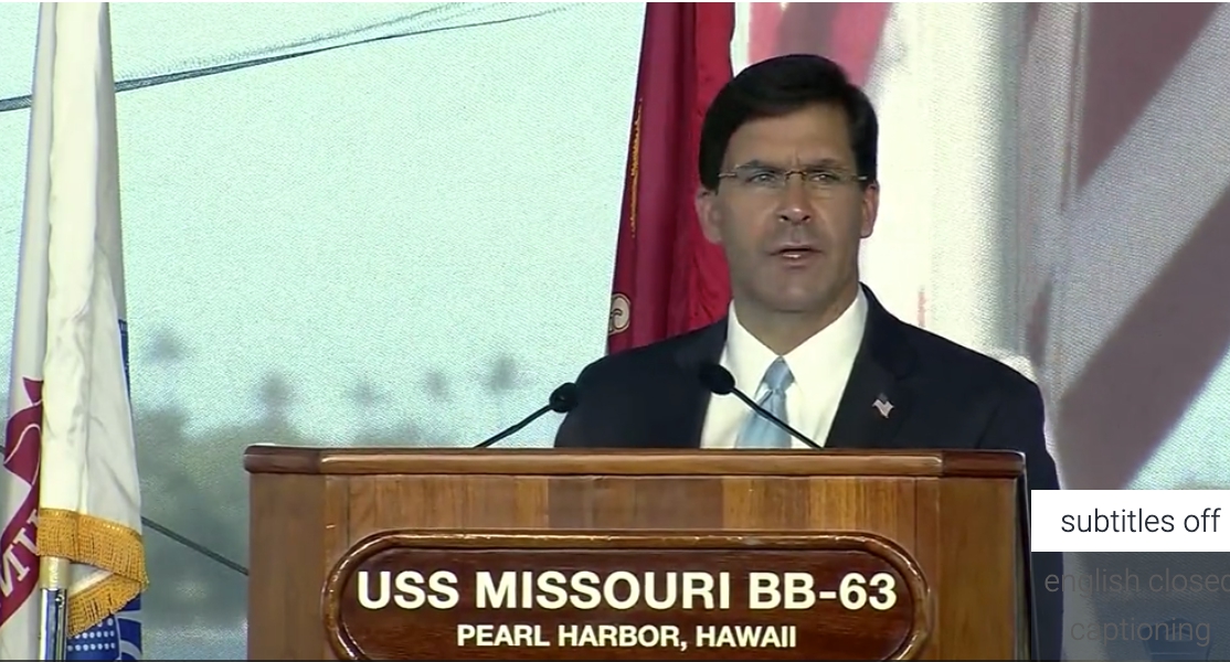 9月2日,美國國防部長艾斯培(Mark Esper)在夏威夷珍珠港,二戰盟軍受降的密蘇里軍艦上發表演說。他表示,美國對世界的承諾和1941年一樣,隨時準備作戰捍衛任何朋友。