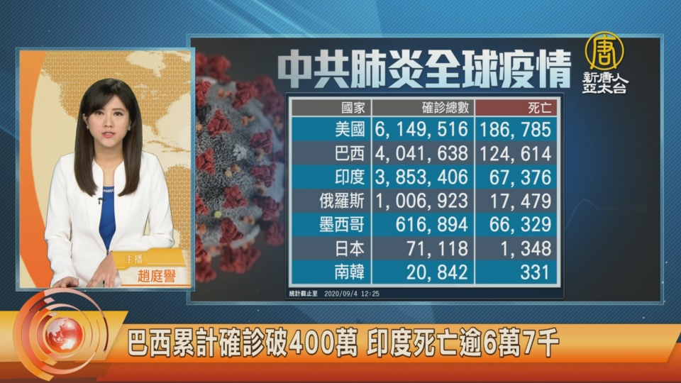 【新唐人亞太台 2020 年 09 月 04 日訊】來關心中共肺炎動態,目前全球公開數據,累計確診超過 2千6百22萬人,死亡86萬7千多人。美國累計確診近 615萬例,死亡 18萬6千多人。巴西新增確診 4萬3千多例、死亡8百多人,累計確診突破 400萬例。另外疫情爆發以來,印度共有 6萬7千多人死亡,是公開數據中受影響最嚴重的亞洲國家。3日,國際特赦組織表示,全球至少有 7千名醫院職工染疫死亡,其中墨西哥就有超過 1千300人,比例相當驚人。南韓連兩天新增確診少於 200例,但大首都圈防控措施將可能再延長。另外,中共、伊朗等國家,被認為嚴重低報數據。