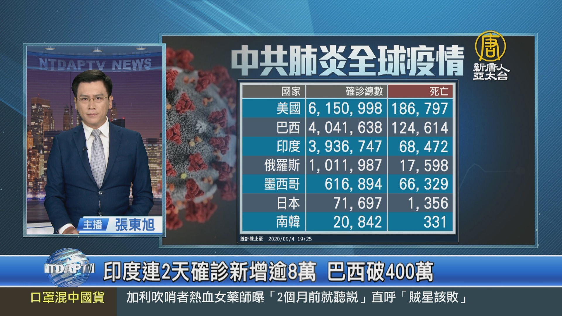 【新唐人亞太台 2020 年 09 月 04 日訊】帶您來關心中共病毒肺炎疫情,全球公開數據累計確診超過2千6百31萬人,86萬8千多人死亡。但中共、伊朗等政權,被認為嚴重低報數據。美國確診超過615萬例、死亡18萬6千多人。巴西9月3日新增4萬3千多例確診,累計破400萬。印度連2天新增確診超過8萬例,連續37天單日增加超5萬例,累計393萬6千多例。國際特赦組織表示,全球至少有 7千名醫院職工染疫死亡,其中墨西哥就超過 1千3百人,比例驚人。南韓單日新增確診連兩天少於2百例,但因不明感染來源的病例仍沒有查出源頭,南韓政府決定將首都圈的加強版防疫措施延長一週到9月13日。日本東京新增136名確診,連續11天單日超過百例。