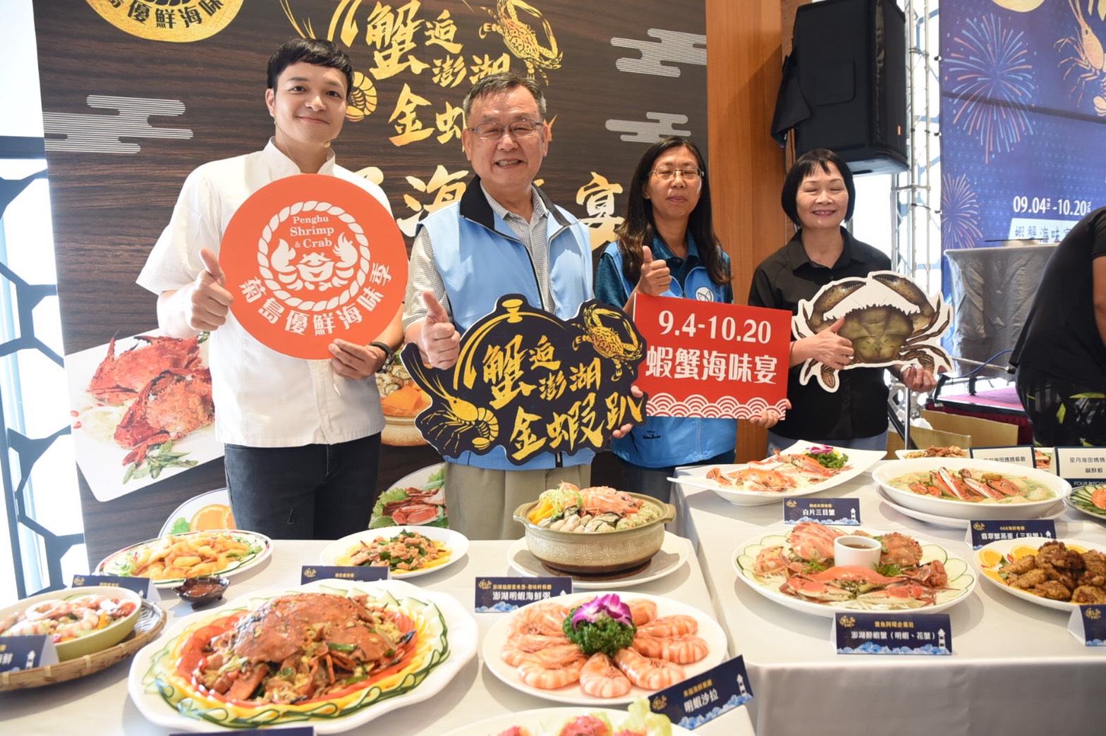 澎湖縣政府農漁局4日舉辦「菊島優先海味季-蟹逅澎湖金蝦趴」起跑記者會,縣長賴峰偉化身主廚,與活動代言人網路名廚「廚佛瑞德」大秀廚藝,烹煮出令人食指大動的「中南美香料蒜味明蝦」,並邀集百人共享「百人蝦蟹海味宴」。