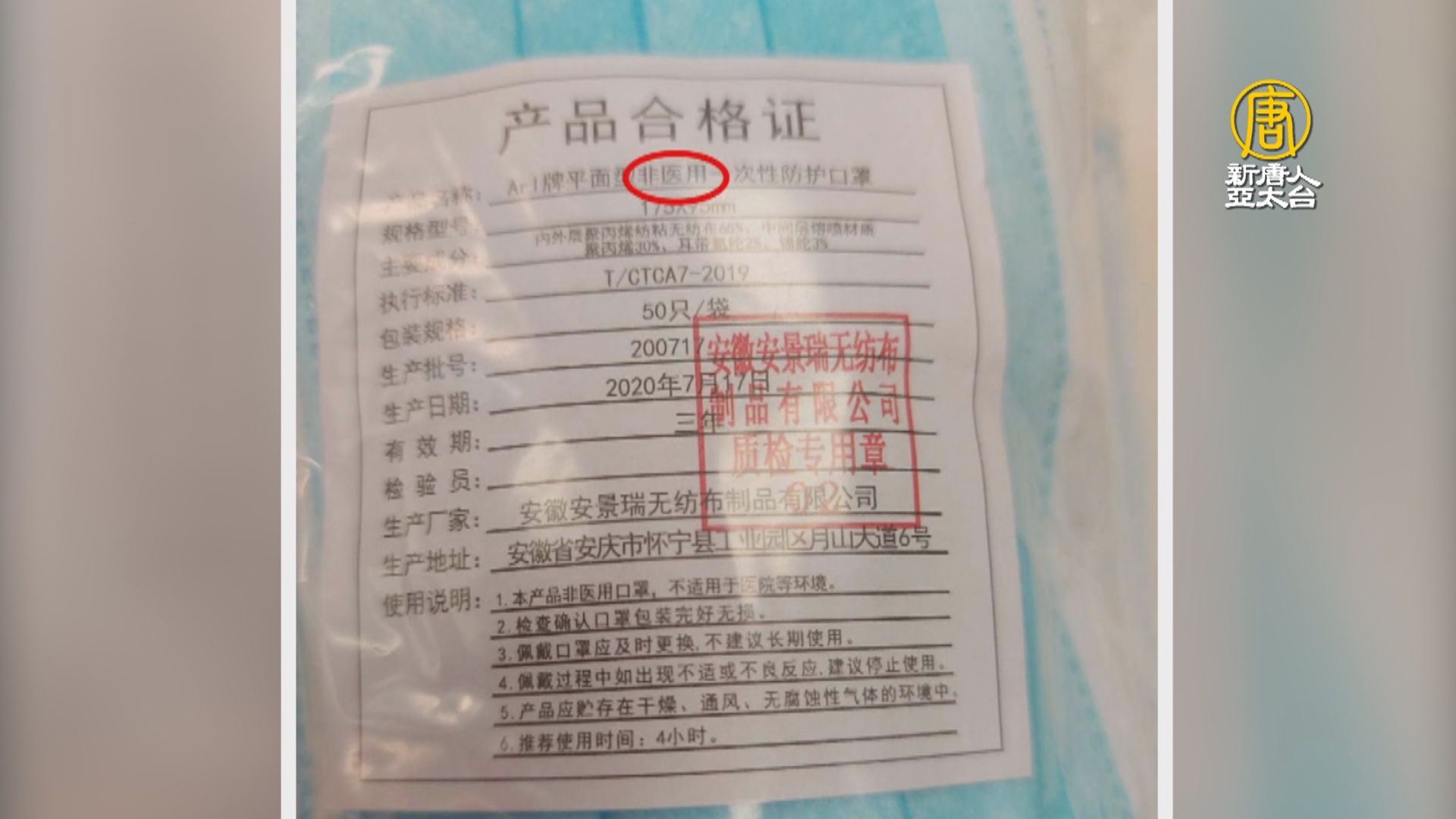 大袋口罩裡,內附產品合格證,寫的是簡體字,蓋的章是「安徽安景瑞」,這就是加利公司進口口罩的中國廠商。