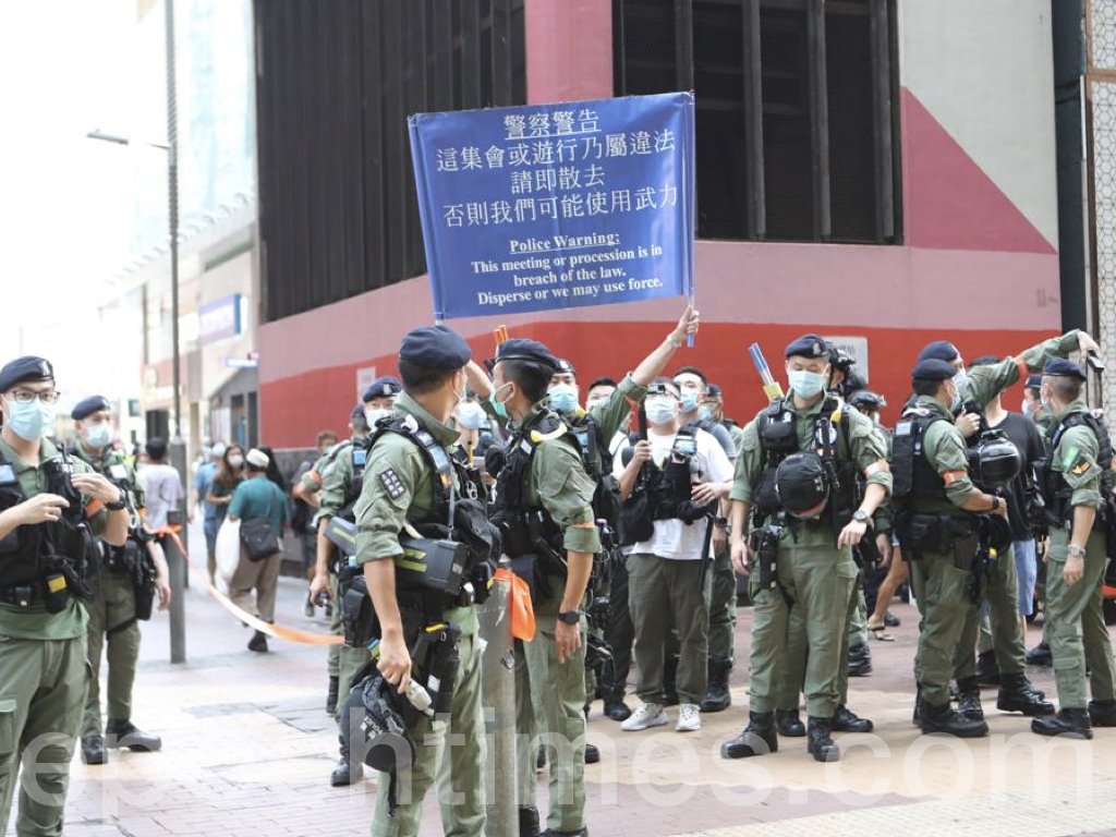 9月6日九龍大遊行促重啟選舉,警方一度舉藍旗警告市民「遊行集會屬違法,可使用武力」,以及拉起橙線將大批市民和記者團團圍住,進行搜查。(圖/ 大紀元)