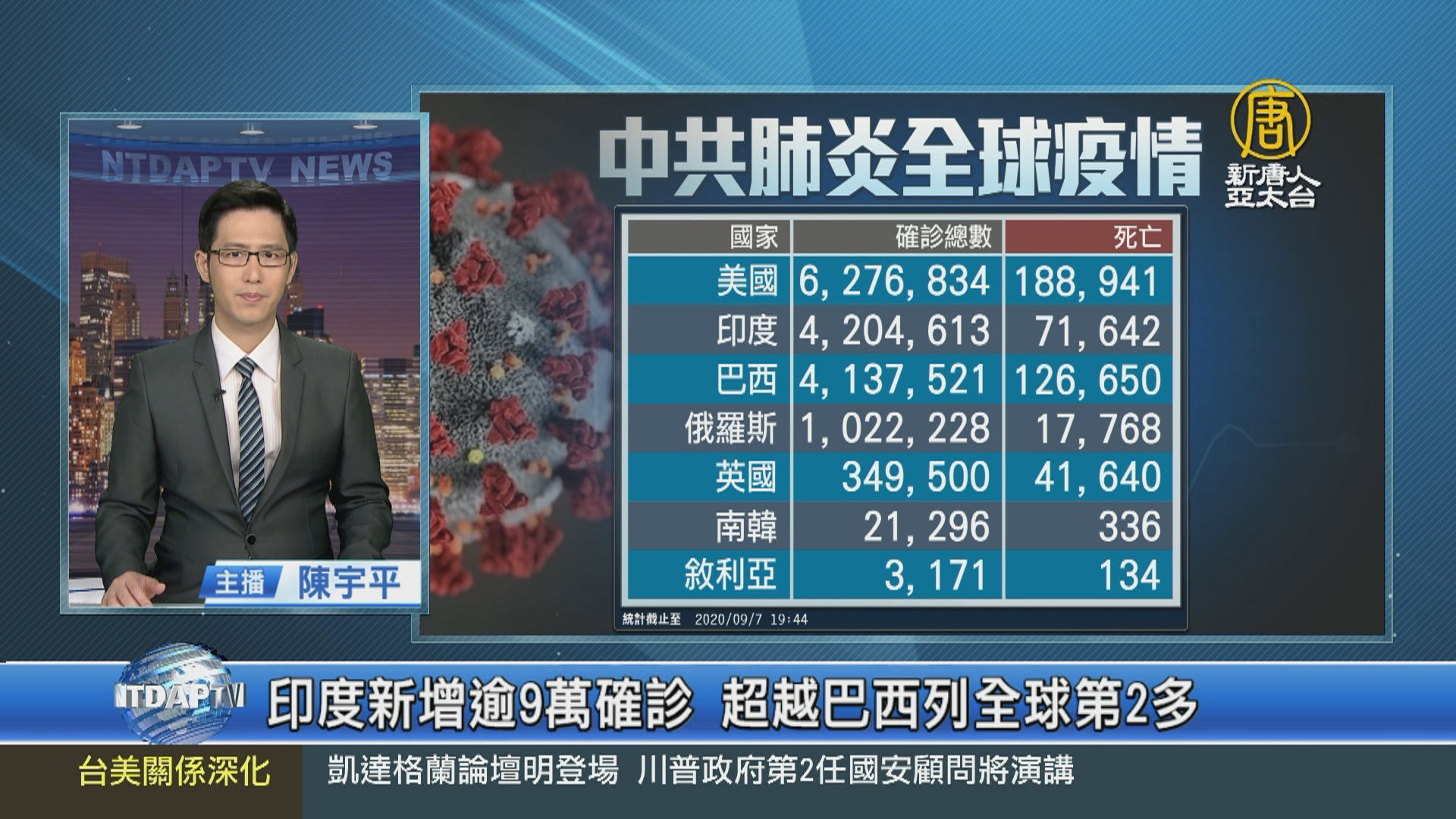 【新唐人亞太台 2020 年 09 月 07 日訊】再來關心肺炎疫情最新情況,全球累計確診超過2千7百11萬人,88萬3千多人死亡。但中共、伊朗等國家,被認為嚴重低報數據。美國確診6百27萬6千多例、死亡超過18萬8千人。印度新增9萬多人確診,累計超過4百20萬4千人染疫,超過巴西的413萬人,成為全球確診第二多的國家。英國6日新增將近3千例確診,創下5月以來的單日新增新高紀錄。敘利亞境內超過2百名聯合國人員染疫,兩個月來感染率暴增10倍,但因為政府可能掩蓋疫情,實際情況恐將更加嚴重。南韓新增119人確診,連5天單日低於2百例。