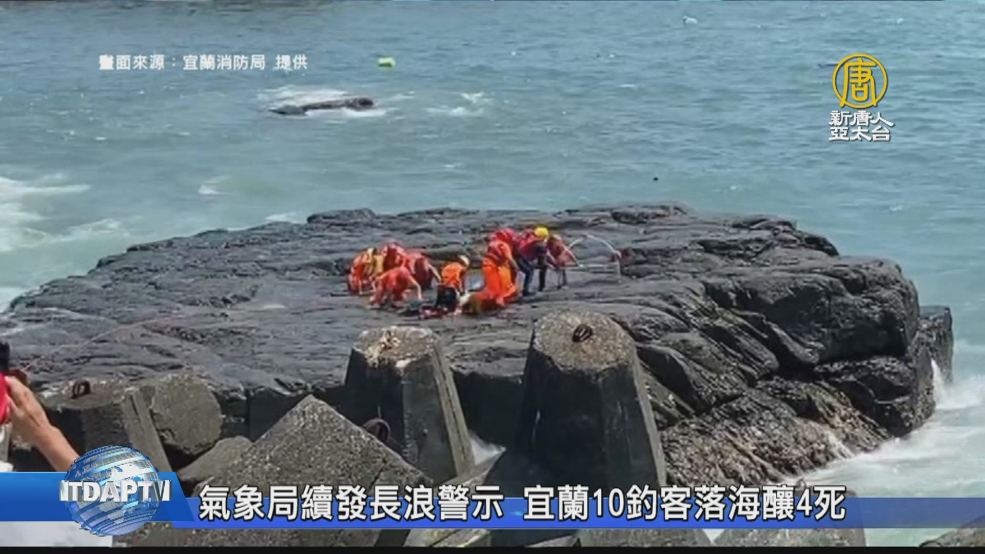 【新唐人亞太台 2020 年 09 月 07 日訊】提醒觀眾朋友,去海邊釣魚要小心,暗藏瘋狗浪的危機,宜蘭縣頭城鎮大溪漁港,今天(7日)上午傳出釣客被海浪打落海的意外,當時有10多名釣客在堤防盡頭的燈塔處違規釣魚,遭突如其來的瘋狗浪打落海,海巡署、宜蘭消防隊、國搜中心獲報後立即派員前往救援,救難人員陸續救起10人,其中4人送醫不治,中央氣象局從5日開始,就針對台灣北部、東半部等沿海地區,發布長浪警示,請民眾到沿海活動時,須留意自身安全。