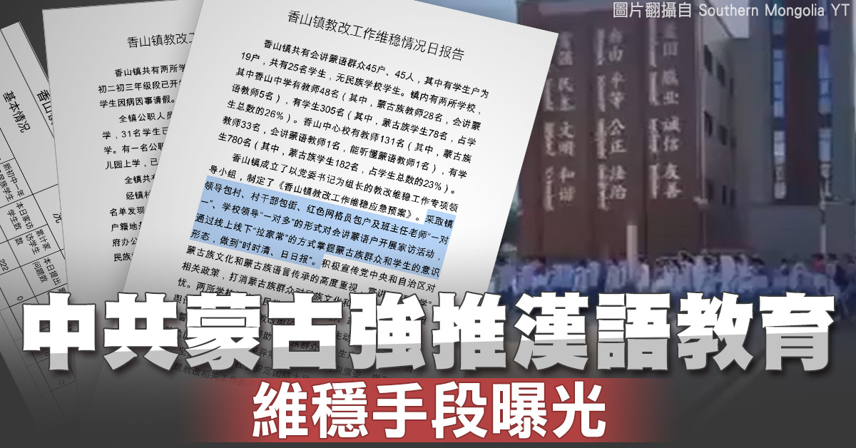 內蒙古地區的民族學校小學一年級和初中一年級試行加強漢語的統一教材,遭到當地學生家長的強力反對,中共當局為此展開了各種「維穩」打壓手段,通過每天報告的形式,監控當地黨員幹部子女在校情況。