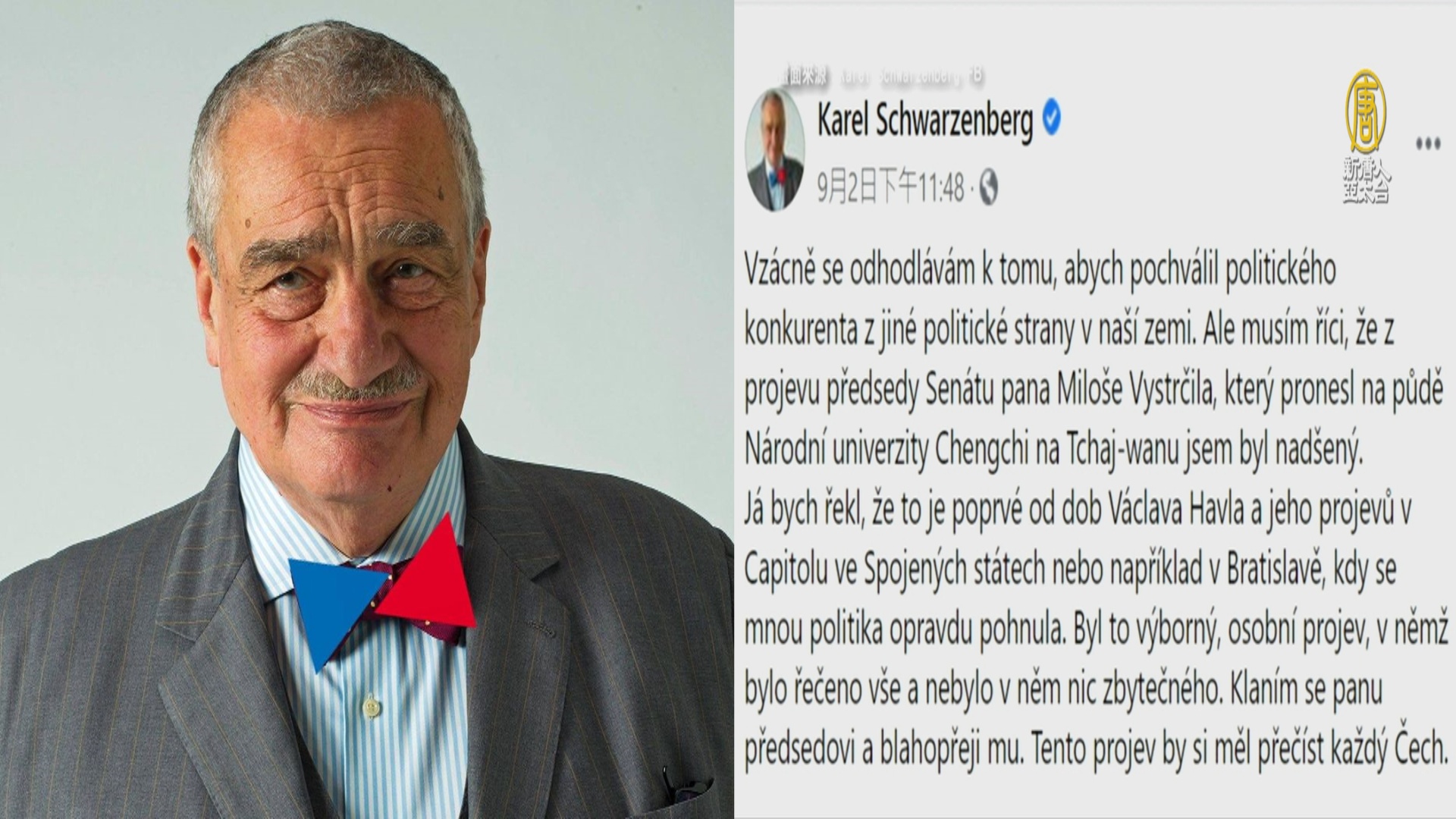 【新唐人亞太台 2020 年 09 月 08 日訊】捷克議長韋德齊9月1號在立法院演說時,一句「我是台灣人」,贏得許多台灣人的讚賞,不過韋德齊本人,似乎對8月31日在政治大學的演說更加滿意,因為提到了更多台灣與捷克都很重要的事,包括捷克在共產高壓的統治下背景。而這場演說透過網路直播,在捷克國內引起許多共鳴,其中包括不同政黨的政治人物。