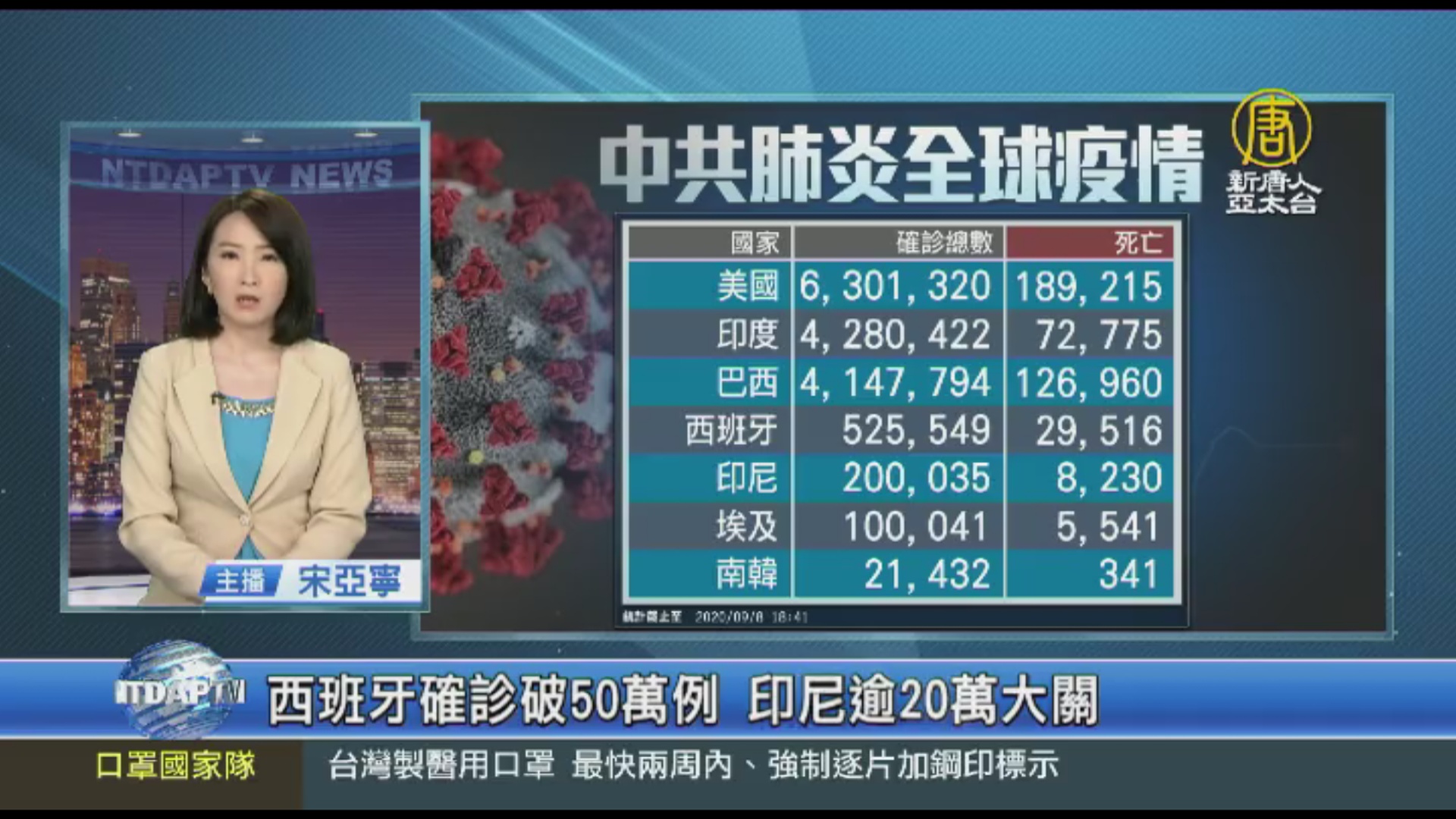 【新唐人亞太台 2020 年 09 月 08 日訊】來關心肺炎疫情最新情況,全球累計確診超過2千7百35萬人,89萬2千多人死亡。但中共、伊朗等國家,被認為嚴重低報數據。美國確診6百30萬1千多例、死亡超過18萬9千人。西班牙新增2千4百多例確診,成為第一個累計突破50萬例的西歐國家。印尼新增3千多例確診,累計超過20萬例,共有8千2百多人病故,是東南亞死亡病例最多的國家。埃及成為繼南非之後,非洲第2個累計確診突破10萬例的國家。南韓新增確診連6天低於2百例,預計週末前確認是否調整首都圈防疫等級。