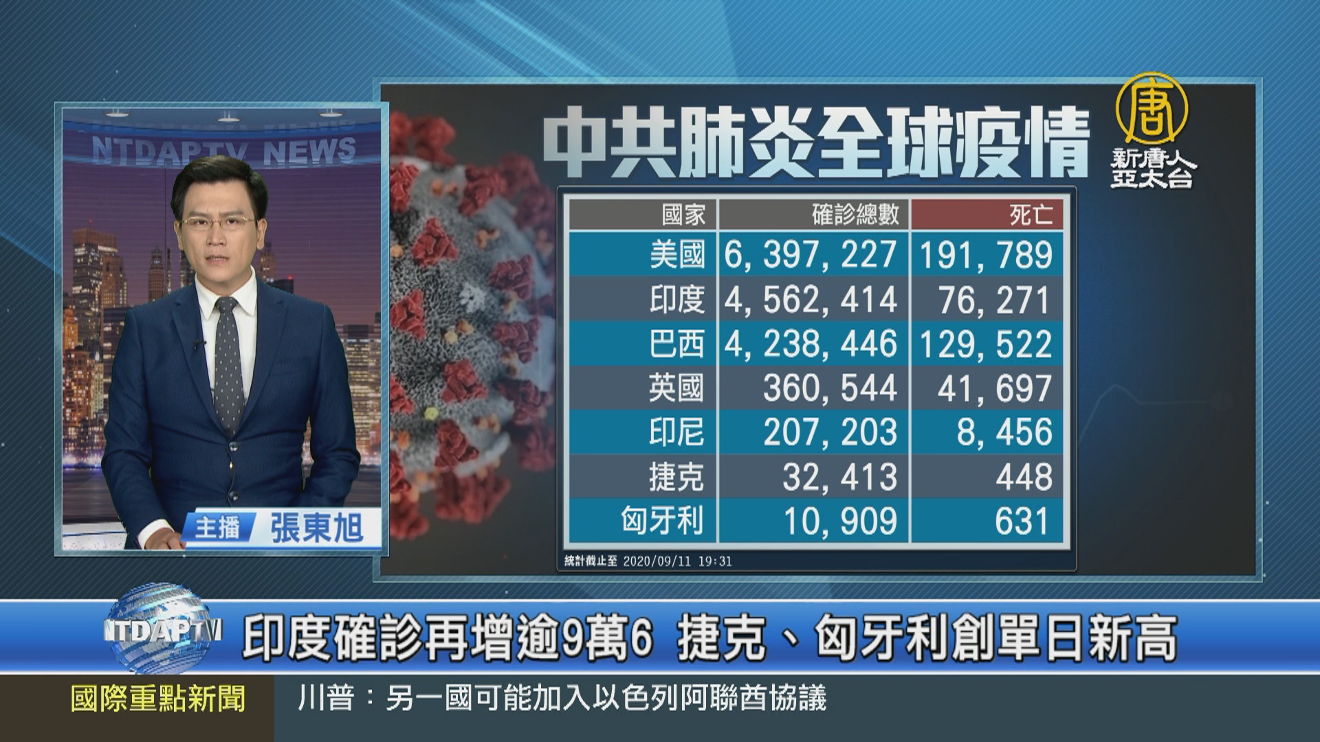 【新唐人亞太台 2020 年 09 月 11 日訊】來看到,中共病毒肺炎疫情最新情況,全球公開數據,累計確診超過2千8百17萬人,90萬9千多人死亡。但中共、伊朗等政權,被認為嚴重低報數據。美國方面,累計確診6百39萬7千多例、死亡超過19萬1千人。美國的死亡與新增確診案例從7月高峰雙雙下滑,但有4成地區的新增病例數上升,原因是學生重返大學城。印度新增9萬6千多例確診,再創單日新增病例紀錄,過去兩週,平均每天通報超過1千人死亡。巴西新增確診4萬多例,累計達4百23萬8千多例。英國疫情再度升高,近來每天新增確診近3千例。印尼首都雅加達的醫療能量逼近極限,為了降低感染速度,雅加達將從14日起恢復軟性封城。歐洲的捷克新增1千3百多例確診,這是連續第二天出現單日千人確診。另外,匈牙利新增7百多例確診,雙雙創下疫情爆發以來的新高紀錄。