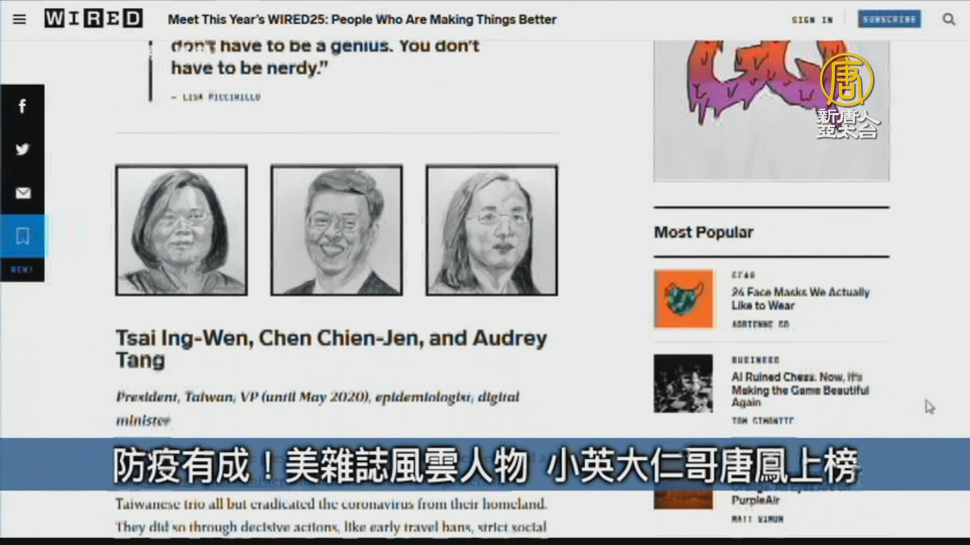 美國知名雜誌「連線」(WIRED)公布今年讓事情變得更好的風雲人物WIRED25名單,總統蔡英文、前副總統陳建仁、行政院政務委員唐鳳因台灣防疫有成,3人同時上榜。