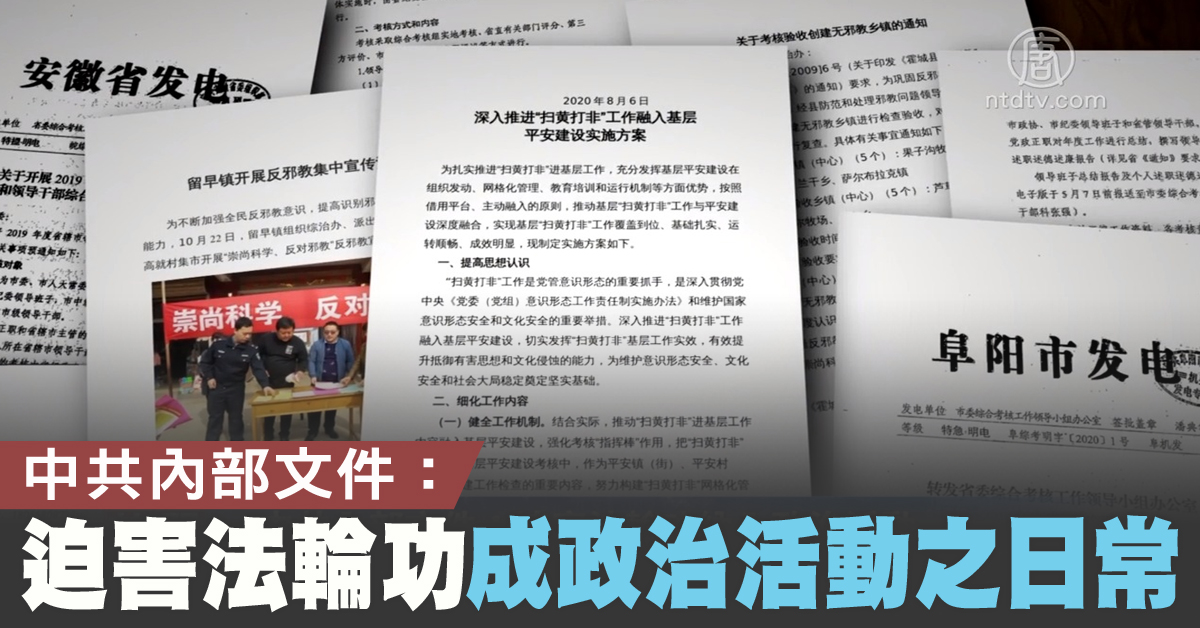 《大紀元時報》日前曝光獨家獲得的中共各省內部文件,其中顯示,迫害法輪功已被融入中共的各項政治活動中,從領導班子考核、「掃黃打非」、「 平安建設 」、「鄉村振興」,甚至到近期疫情防控等方方面面,都有打壓法輪功的內容。