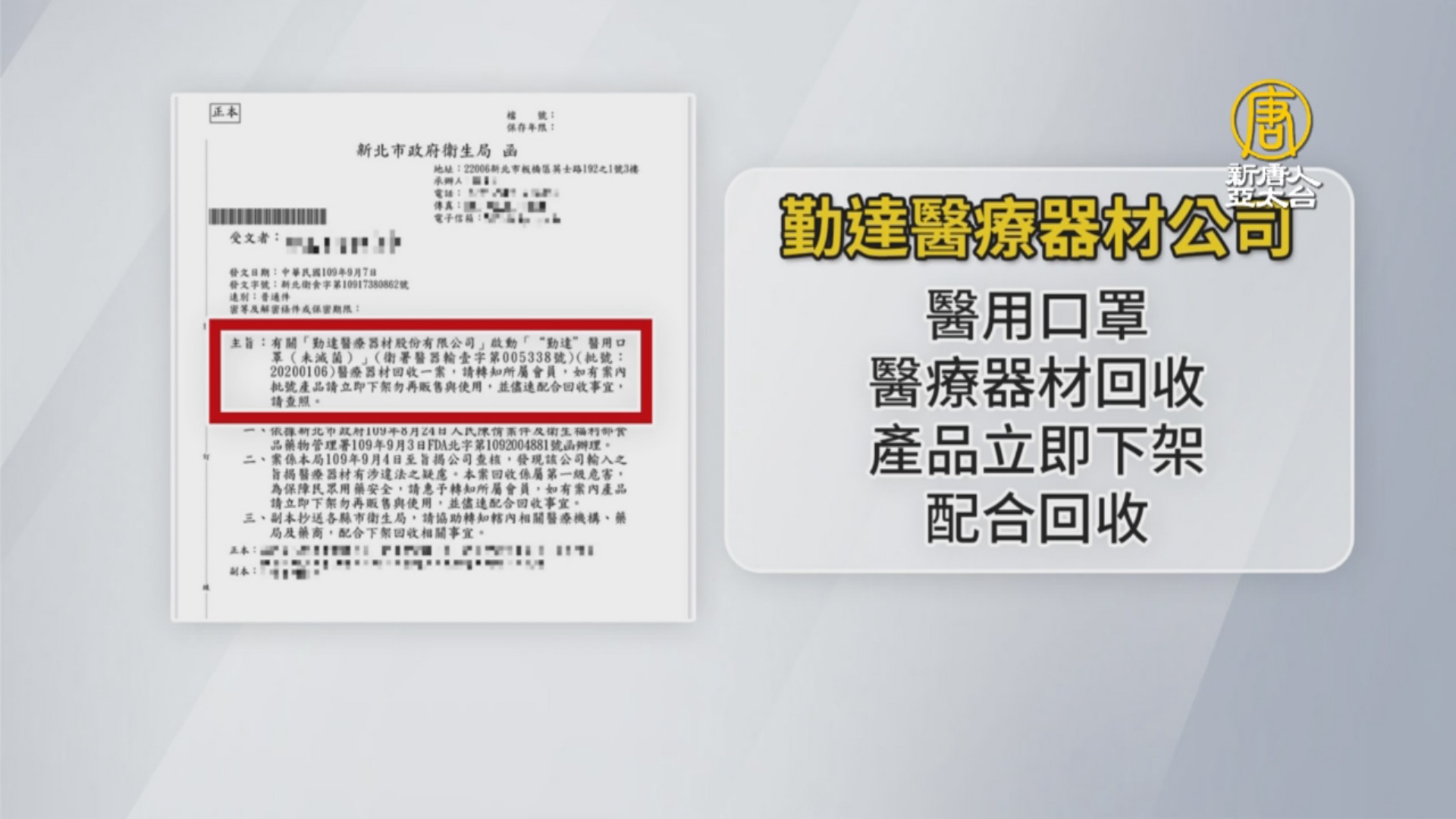 【新唐人亞太台 2020 年 09 月 15 日訊】又爆發問題口罩事件,新北市衛生局接獲通報,轄區一間「勤達」醫療器材公司,涉嫌把打著馬來西亞的名號,販售中國生產的口罩,目前檢調已封存六萬片口罩。勤達至今仍未出面回應,而這間「勤達」公司的負責人,據傳是「廣達香食品」的少東,勤達下午也在官網公告退貨4步驟,自即日起至10月7日止接受退貨、退款。