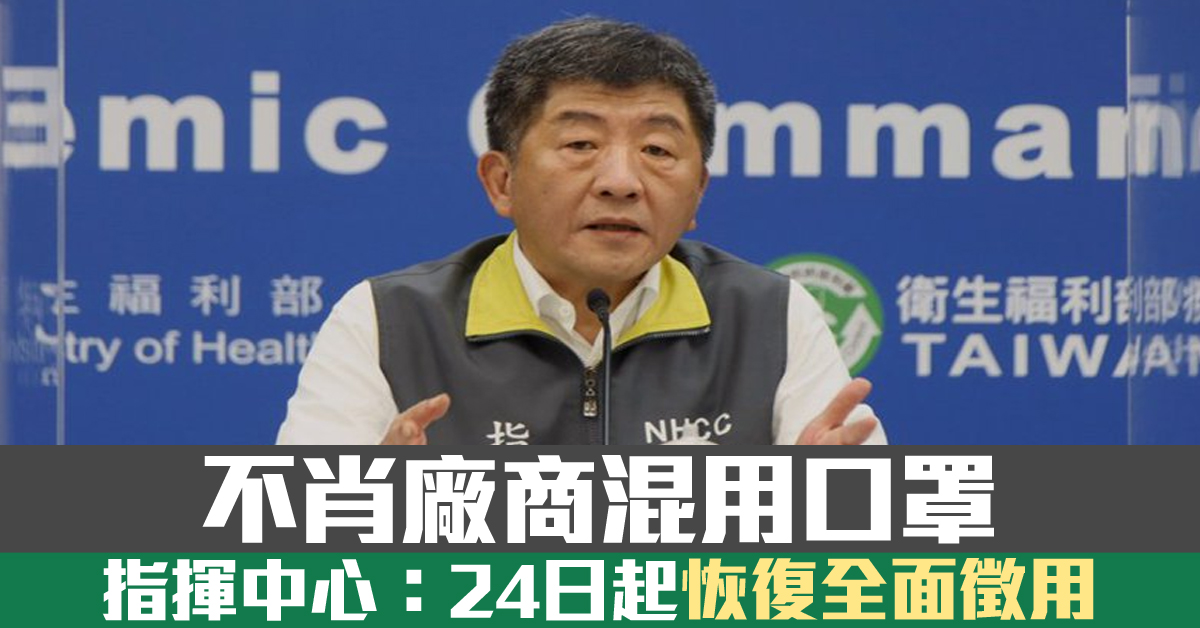 繼陸續傳出黑心廠商混用中國製非醫療用口罩等亂象,凸顯食藥署無力管控,指揮中心決定將口罩業務收回,恢復全面徵用口罩。
