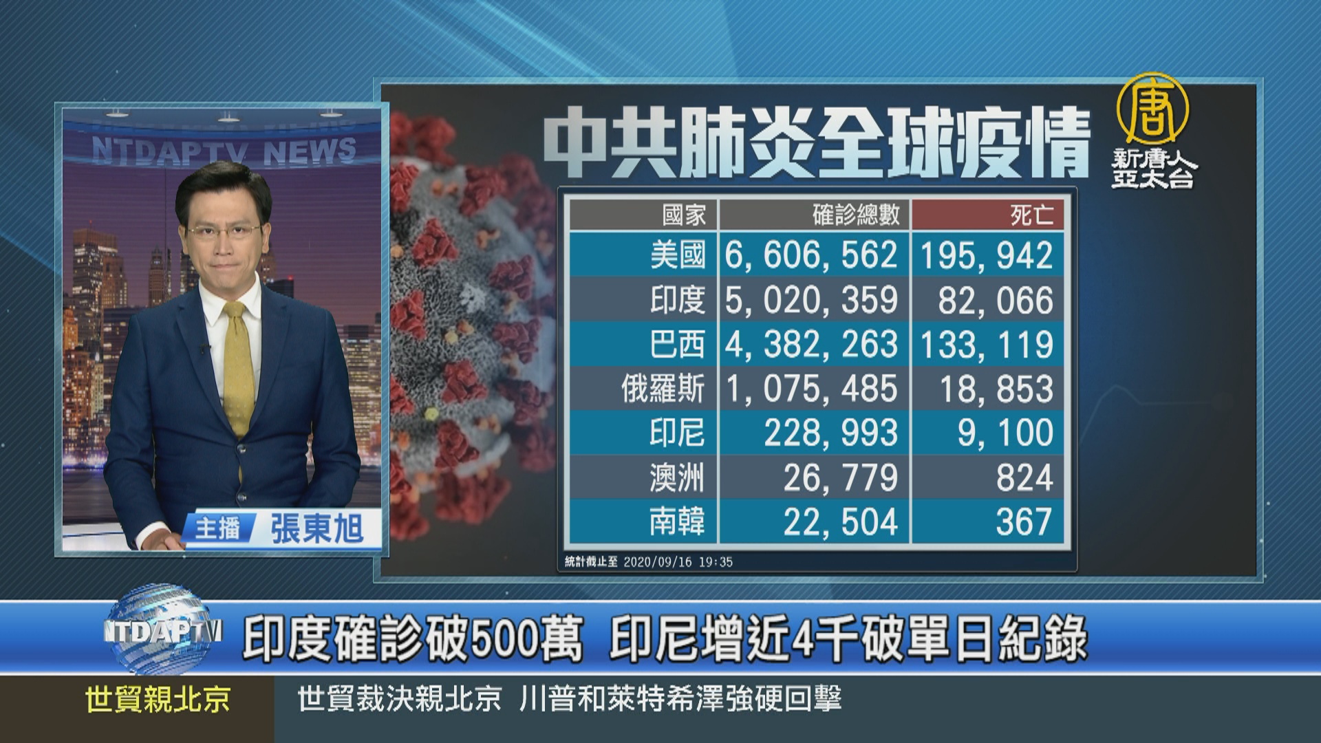 【新唐人亞太台 2020 年 09 月 16 日訊】來關心中共病毒肺炎最新疫情,全球公開數據,累計確診超過2千9百59萬人,93萬5千多人死亡。但中共、伊朗等政權,被認為嚴重低報數據。美國方面,確診6百60萬6千多例、死亡超過19萬5千人。印度再度單日新增超過9萬起確診,累計突破5百萬。巴西單日新增3萬6千多例確診,累計超過4百38萬2千例。印尼單日新增將近4千例確診,創下疫情爆發以來單日新高。澳洲15日通報,2個月來首次沒有新增死亡病例,新增病例數趨緩。南韓疫情也放緩,首都圈單日新增病例逐漸減少,但感染來源不明的病例高達25%,輿論擔心疫情隨時可能反彈。