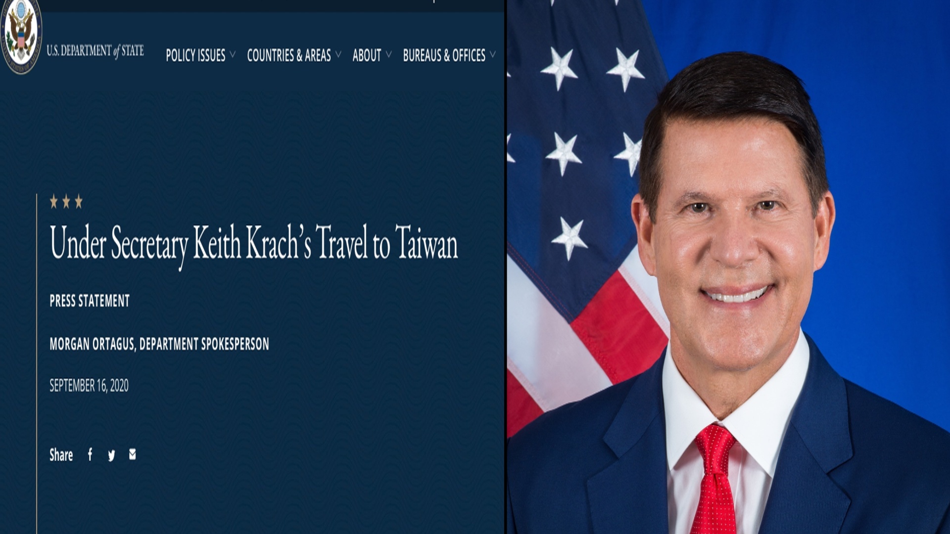 【新唐人亞太台 2020 年 09 月 17 日訊】早安新唐人先來關心,美國國務院在今天台北時間凌晨宣布,次卿柯拉克訪問台灣,這是國務院41年來訪台最高層級,中華民國外交部也在國務院聲明發出後,發表談話。