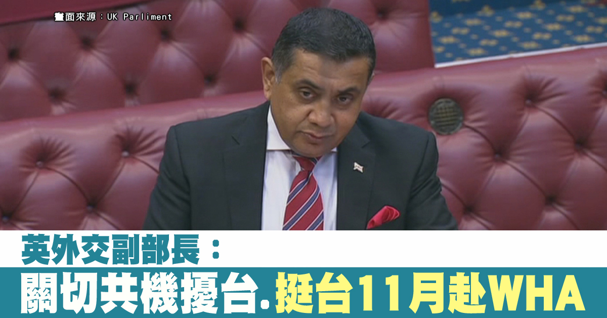 英國主管南亞與國協事務的外交部副部長(Lord Ahmad of Wimbledon),關切任何可能破壞台海現狀的舉措;回應多位上議員質詢,中共軍機擾台。