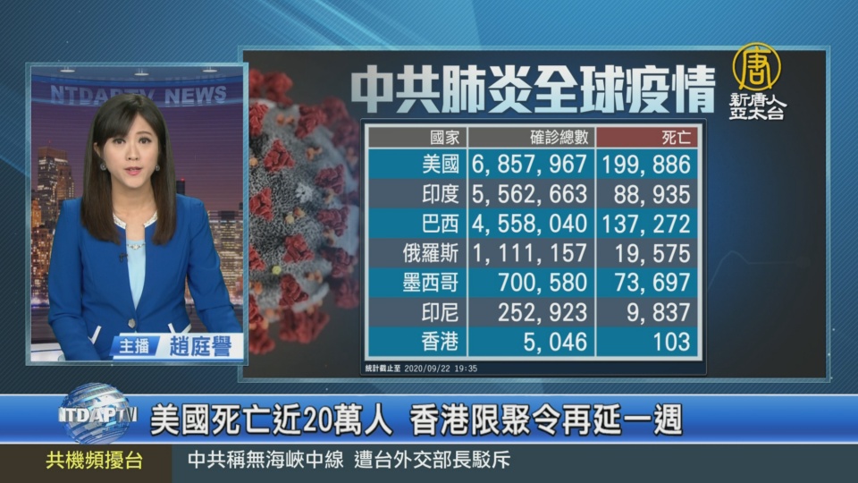 【新唐人亞太台 2020 年 09 月 22 日訊】來關心肺炎疫情最新情況,全球累計確診超過3千1百33萬人,96萬5千多人死亡。但中共、伊朗等國家,被認為嚴重低報數據。美國確診6百85萬7千多例、死亡將近20萬人。印度確診升到5百56萬2千多例,新增7萬5千多人染疫。巴西新增1萬3千多例確診,累計達4百55萬8千多例。墨西哥確診突破70萬例。印尼新增160人死亡,是單日死亡新高,累計9千8百多人死亡。香港新增8起確診,但週四午夜屆滿的限聚令,延長7天至10月1日,恰好是中共建政日,對此,香港眾志前副秘書長周庭暗諷,「時間真是算得剛剛好」。