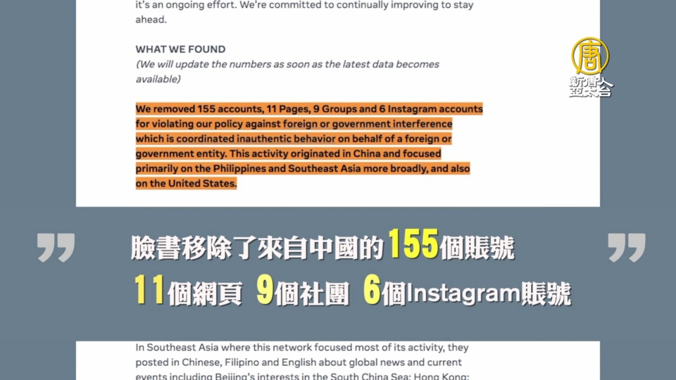 【新唐人亞太台 2020 年 09 月 24 日訊】社交媒體臉書,週二表示,刪除了大量來自中國和菲律賓的虛假帳號,這些帳號涉及替外國政府進行「虛假宣傳」。