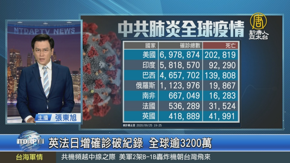【新唐人亞太台 2020 年 09 月 25 日訊】帶您看到,目前肺炎疫情最新情況,全球累計確診超過3千2百23萬人,98萬3千多人死亡。但中共、伊朗等國家,被認為嚴重低報數據。美國確診6百97萬8千多例、死亡超過20萬2千人。印度過去24小時內,再度新增確診8萬6千多例,累計超過5百81萬8千例。為印度研製核潛艦核子反應爐的資深核能專家巴蘇,24日也染疫身亡。巴西新增3萬2千多例確診,受疫情影響,里約熱內盧原訂明年2月舉行的嘉年華遊行將取消。英國、法國24日都通報了單日最高記錄的新增病例數,世界衛生組織的專家還警告,非洲的病患數中,可能有至少 80% 是無症狀感染者。